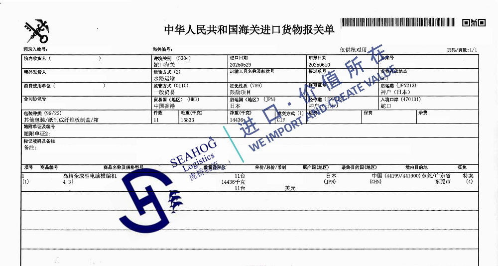 There were two separate shipments yet both were shipped from Japan and imported via Guangzhou Nansha port. The first shipment, arrived at Nansha port on May 29, 2025, contained 11 x Full-form computer flat knitting machines, while the second shipment had another 30 x Computer flat knitting machines and it reached at Nansha on June 8, 2025. Seahog initiated the import declarations for both shipments on June 10, 2025 and helped the client obtain import duty/tax free. Below picture was taken when those machines were delivered to the factory.