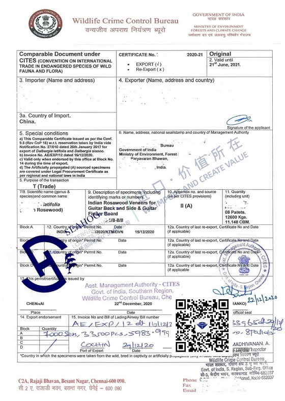 At present, Indian Rosewood has been listed as endangered species. To import logs plates and veneer of bambay blackwood to China needs CITES certificate issued by exporting country and permit for import & export from China, while the import of spare parts and accessories of musical instruments needs the species identification certificate from China¡¯s Office of endangered species import & Export management.